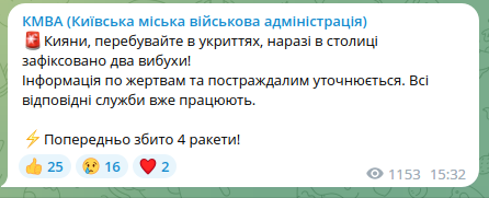 КМДА повідомила про чотири збиті українською ППО ракети.