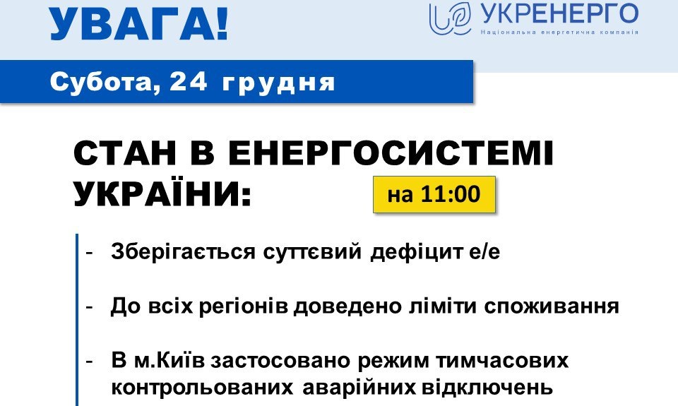 Найбільш складна ситуація в Києві та Київській області, через наслідки атаки дронів 19 грудня, та на сході та півдні — там росія завдала нові артилерійські удари по прифронтових районах, є пошкодження на об'єктах енергетичної інфраструктури. Там, де це можливо, ремонтні роботи тривають цілодобово, — наголосили в «Укренерго».
