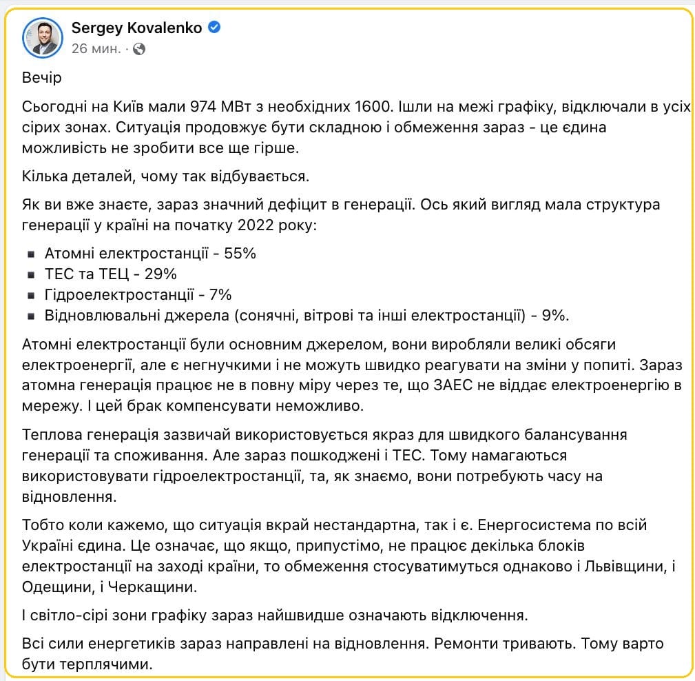 Києву сьогодні (16 січня — ред.) дали всього 974 МВт із необхідних 1600 МВт. У зв’язку з цим світло відключали у всіх сірих зонах графіків, — зазначив Коваленко.