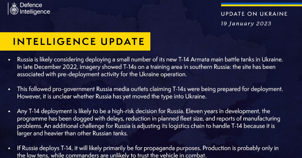 Британська розвідка вважає, що якщо рф і перекине «Армату» в Україну, то це відбудеться у пропагандистських цілях. Їх виробництво може становити лише кілька десятків, а командири екіпажів навряд чи будуть довіряти цій машині в бою.
