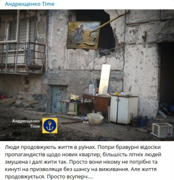 Тож мешканці окупованого міста змушені продовжувати життя в руїнах, наголошує у своєму Telegram-каналі радник міського голови Маріуполя Петро Андрющенко.