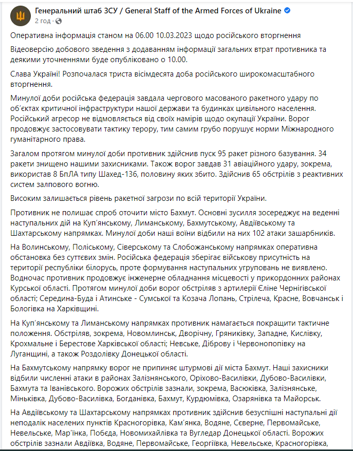 https://racurs.ua/ua/n180746-zsu-vidbyly-ponad-100-atak-syly-rf-pragnut-otochyty-bahmut-genshtab.htmlРакурсСили оборони України минулої доби відбили 102 атаки російських окупантів на Куп’янському, Лиманському, Бахмутському, Авдіївському та Шахтарському напрямах. Про це 10 березня повідомив Генеральний штаб Збройних сил України.