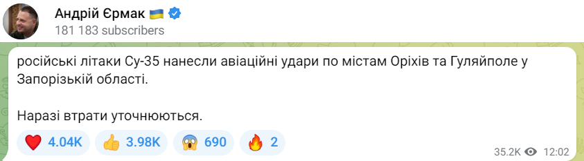 Російські літаки Су-35 нанесли авіаційні удари по містам Оріхів та Гуляйполе у Запорізькій області. Наразі втрати уточнюються, — написав чиновник.