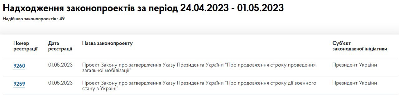 https://racurs.ua/ua/n182583-zelenskyy-vnis-u-radu-zakonoproekty-pro-podovjennya-diyi-voiennogo-stanu-ta-mobilizaciyi.htmlРакурсПрезидент України Володимир Зеленський вніс 1 травня у Раду законопроекти про подовження дії воєнного стану та загальної мобілізації.