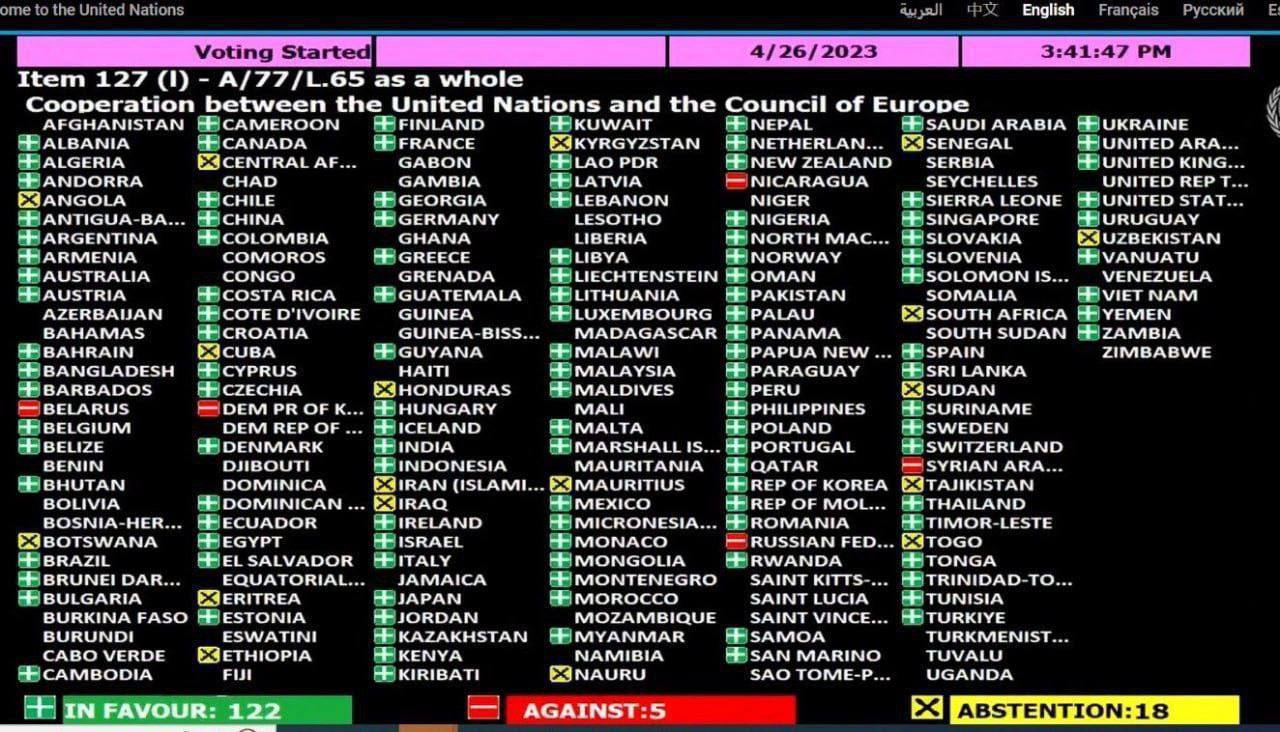 Резолюцію, оприлюднену на офіційних веб-ресурсах ООН, ухвалено 26 квітня 122 голосами «за».