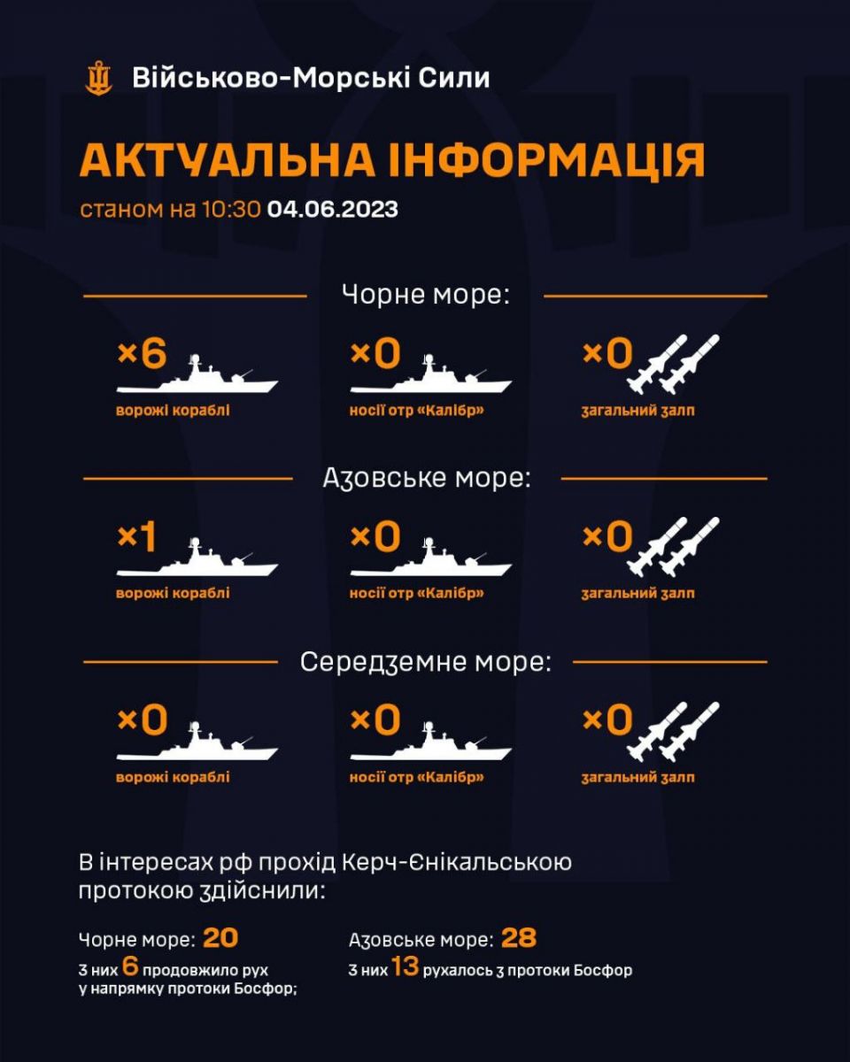 Також стало відомо, що станом на ранок 4 червня в акваторії Чорного моря відсутні ракетоносії. Також «Калібрами» вночі Україну ворог не атакував, бо цьому не сприяла погода.