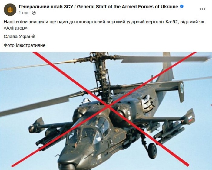 Українські військові знищили російський вертоліт Ка-52, фото: Генштаб ЗСУ