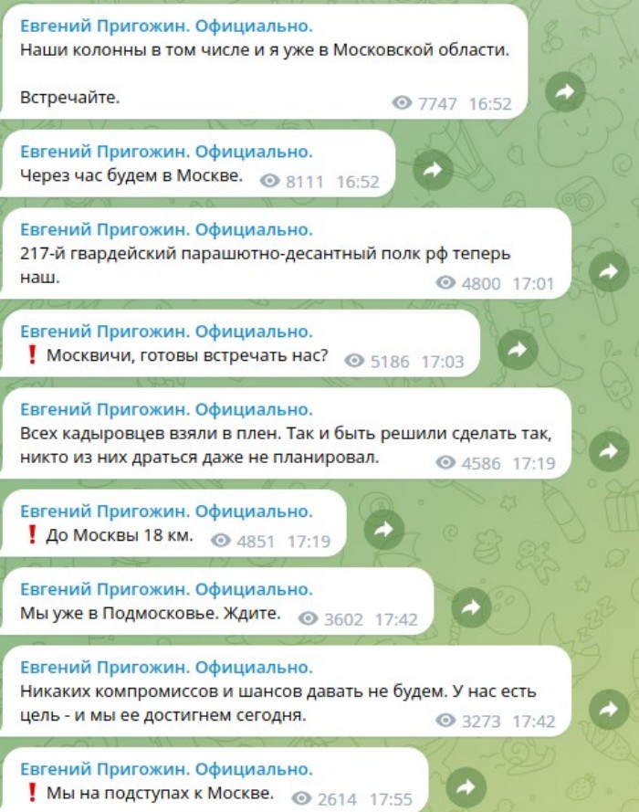 https://racurs.ua/ua/n184436-prygojyn-zayavyv-scho-yogo-viyska-vje-na-pidstupah-do-moskvy.htmlРакурсЄвген Пригожин, ватажок ПВК «Вагнер» заявив, що він разом зі своїми військами сьогодні, 24 ввечері, вже дістався Московської області.