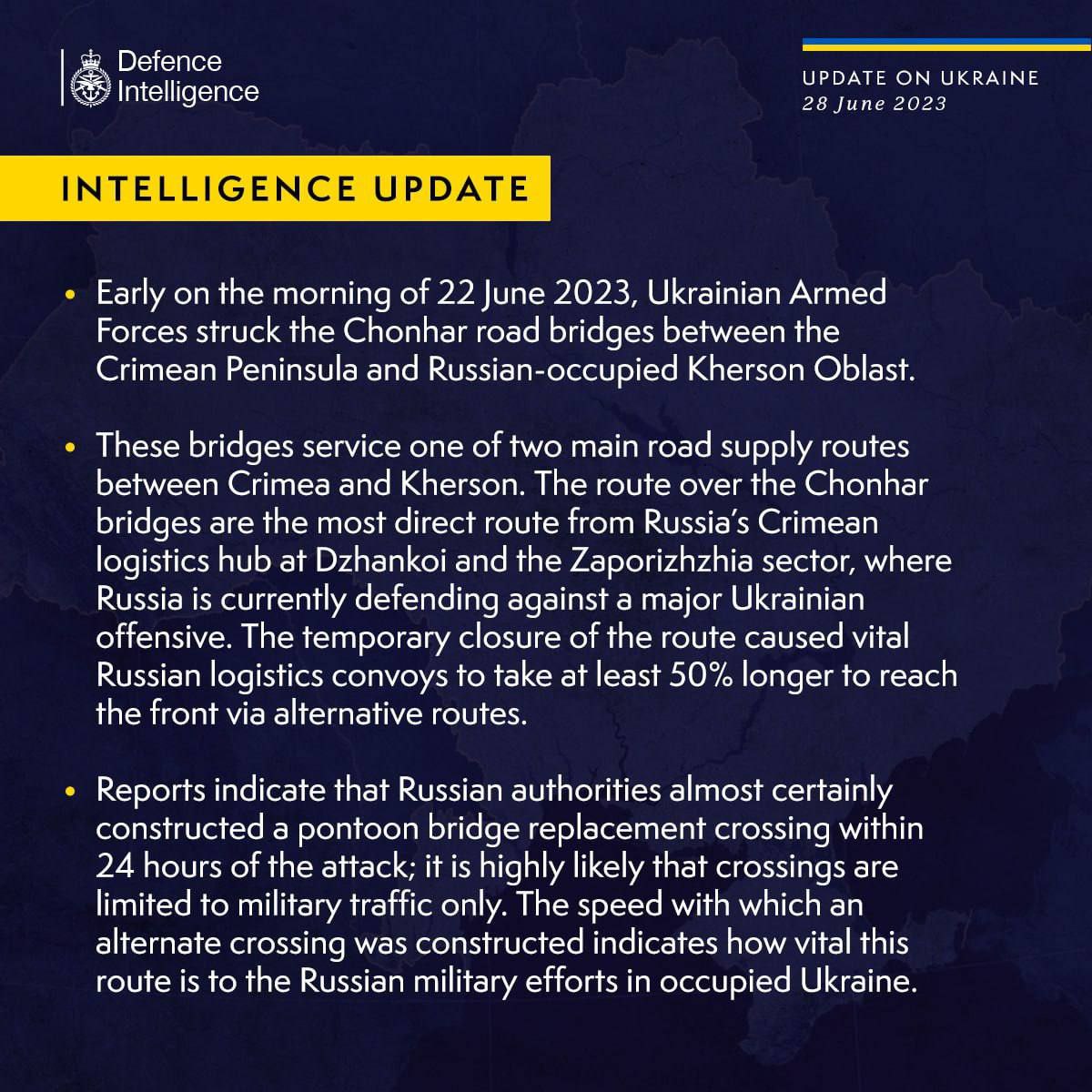 Ці три мости обслуговують один з двох головних шляхів постачання російських загарбницьких військ між Кримом і Херсонщиною. Їхнє руйнування змусило загарбників швидко зводити понтонні переправи. Про це 28 червня повідомило Міністерство оборони Великої Британії у Twitter, посилаючись на дані розвідки.