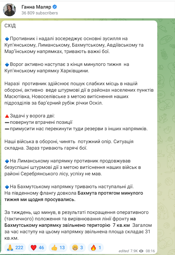 Противник і надалі зосереджує основні зусилля на Куп’янському, Лиманському, Бахмутському, Авдіївському та Мар’їнському напрямках, тривають важкі бої. Ворог активно наступає з кінця минулого тижня на Куп’янському напрямку Харківщини, — додала Маляр.