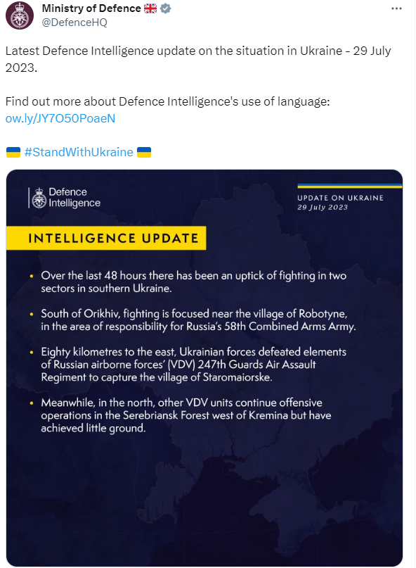 Про це йдеться у розвідувальному огляді Міністерства оборони Великої Британії, оприлюдненому 29 липня.