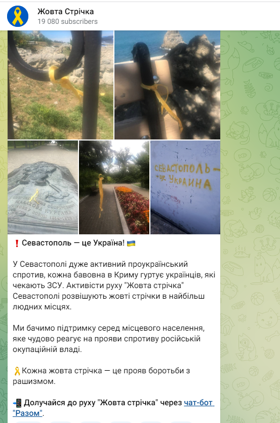 У Севастополі дуже активний проукраїнський спротив, кожна бавовна в тимчасово окупованому Криму гуртує українців, які чекають Збройні сили України… Ми бачимо підтримку серед місцевого населення, яке чудово реагує на прояви спротиву російській окупаційній владі. Кожна жовта стрічка — це прояв боротьби з рашизмом, — йдеться у повідомленні руху «Жовта стрічка».
