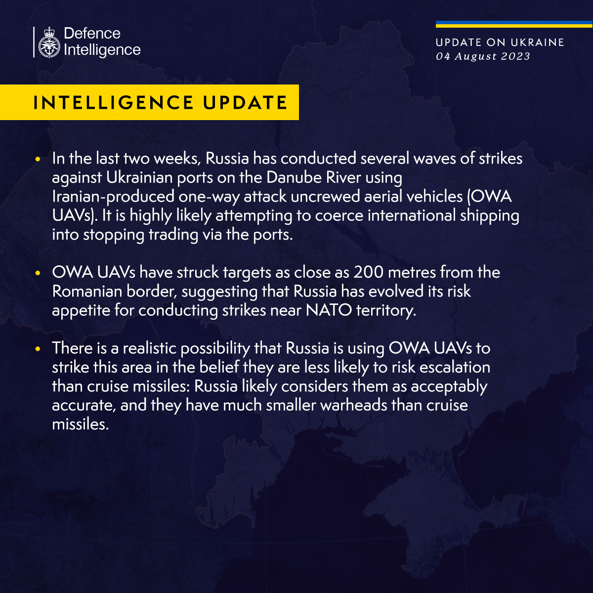 Агресор обрав для ударів саме іранські дрони-камікадзе типу «Шахед», бо вони несуть менший ризик ескалації, ніж крилаті ракети. Ймовірно, що москва так намагається змусити міжнародне судноплавство припинити торгівлю через ці порти. Про це Міністерство оборони Великої Британії 4 серпня повідомило в Twitter.