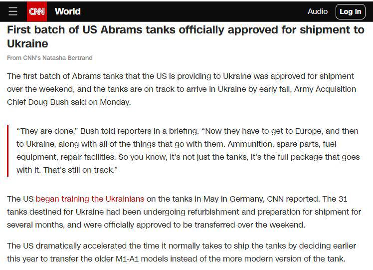 Вони вже готові. Тепер вони мають потрапити до Європи, а потім до України, разом з усім, що до них додається. Боєприпаси, запчастини, паливне обладнання, ремонтні засоби. Тобто, це не просто танки, це повний пакет, який йде разом з ними. Це все ще в процесі, — цитує Буша CNN.