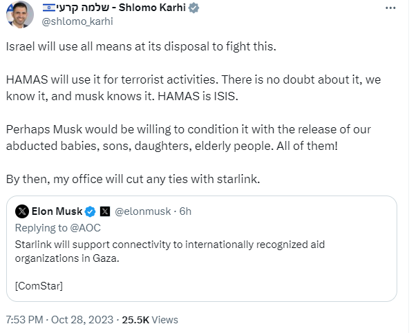 Така заява Маска пролунала у відповідь на заяву представника США Александрії Окасіо-Кортес про те, що відключення зв’язку у Газі є «неприйнятним». Гуманітарні групи заявляли, що вони не можуть сконтактуватися зі своїми командами в Секторі Газа після того, як телефонна та інтернет-служба припинили роботу під час інтенсивного бомбардування Ізраїлем в рамках наземної операції.