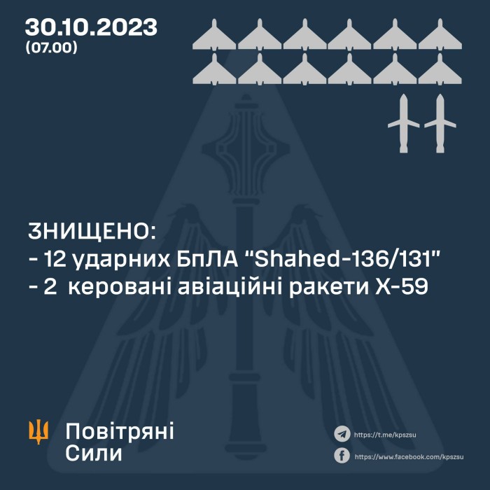 https://racurs.ua/ua/n188819-12-shahediv-ta-dvi-rakety-zbyly-syly-ppo-v-nich-na-30-jovtnya-infografika.htmlРакурсРосійські загарбники в ніч на сьогодні, 30 жовтня, атакували Україну 12 ударними БПЛА типу Shahed та двома керованими авіаційними ракетами Х-59.