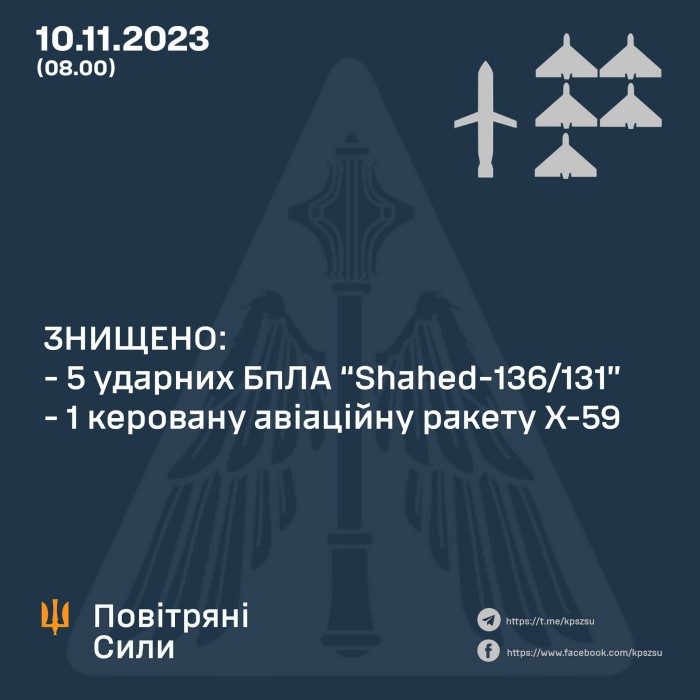 Силами та засобами Повітряних Сил, у взаємодії з ППО Сил оборони України, знищено п’ять ударних БпЛА та одну керовану авіаційну ракету Х-59 в межах Дніпропетровської, Харківської, Миколаївської, Полтавської та Київської областей», — зазначають у Повітряних силах.