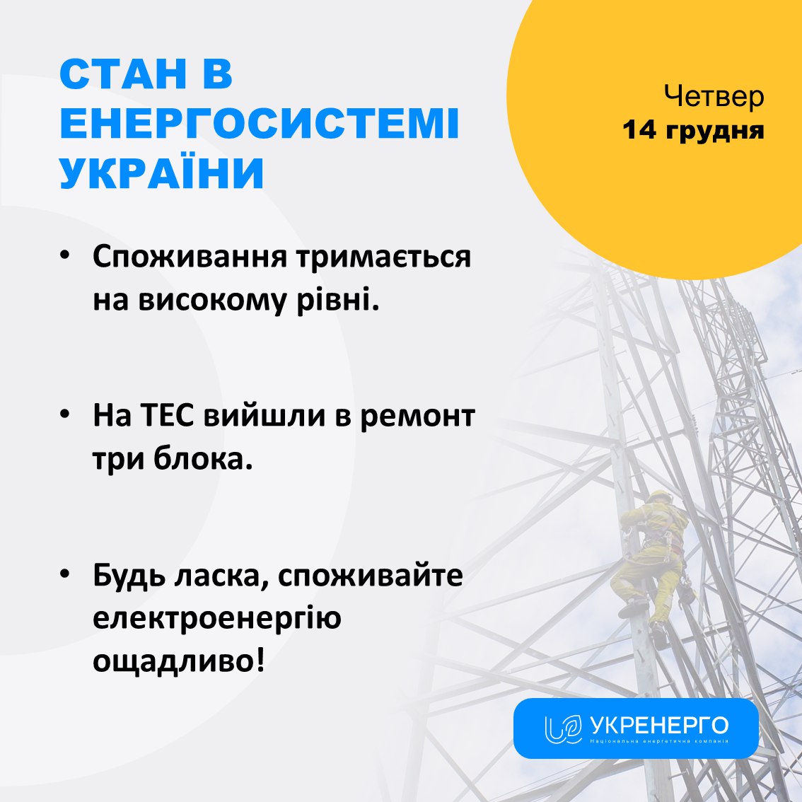 Укренерго змушене вдаватися до імпорту електроенергії. Він здійснюється в денні години зі Словаччини, Румунії та Молдови. Загальний обсяг 3 429 МВт·год, з максимальною потужністю в окремі години до 621 МВт. З 1 грудня технічна можливість імпорту електроенергії з Європи до України та Молдови складає 1700 МВт.