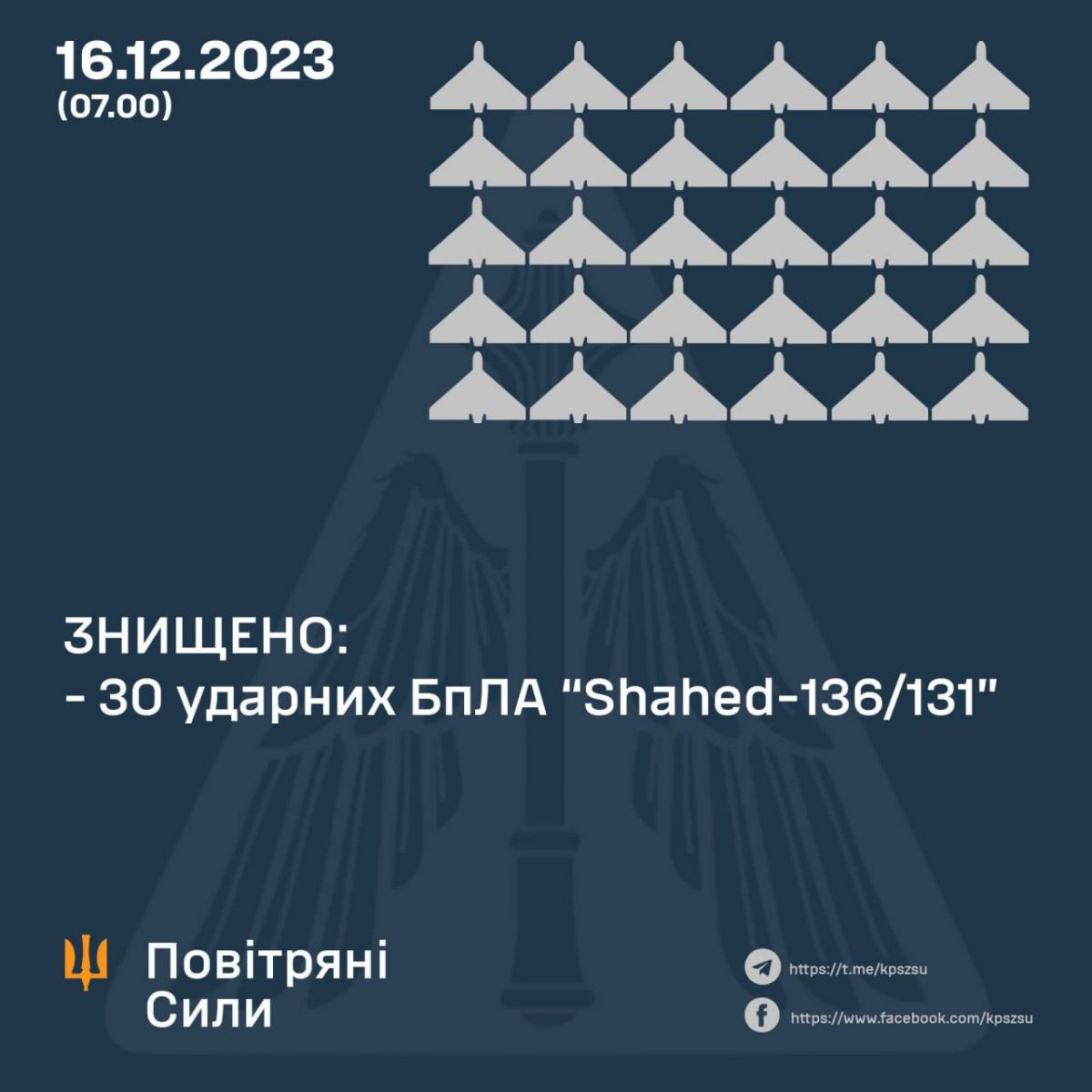 https://racurs.ua/ua/n190392-ciieyi-nochi-syly-ppo-znyschyly-30-z-31-shahediv-kyyiv-atakuvaly-u-grudni-vshoste.htmlРакурсУ ніч проти 16 грудня росіяни атакували Україну 31 «шахедом». Наша ППО збила 30 БПЛА.