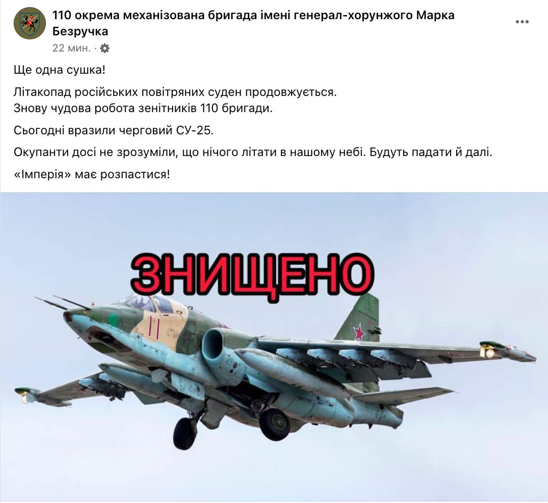 Російський Су-25 збили бійці 110-ї бригади на Донеччині