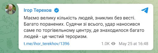 У суботу, 25 травня, близько 16.00 пролунали вибухи. Ворог завдав удару по спальному району міста, був приліт у щільній цивільній забудові. На місці працюють всі відповідні служби. Про це мер Харкова Ігор Терехов повідомив у Telegram.