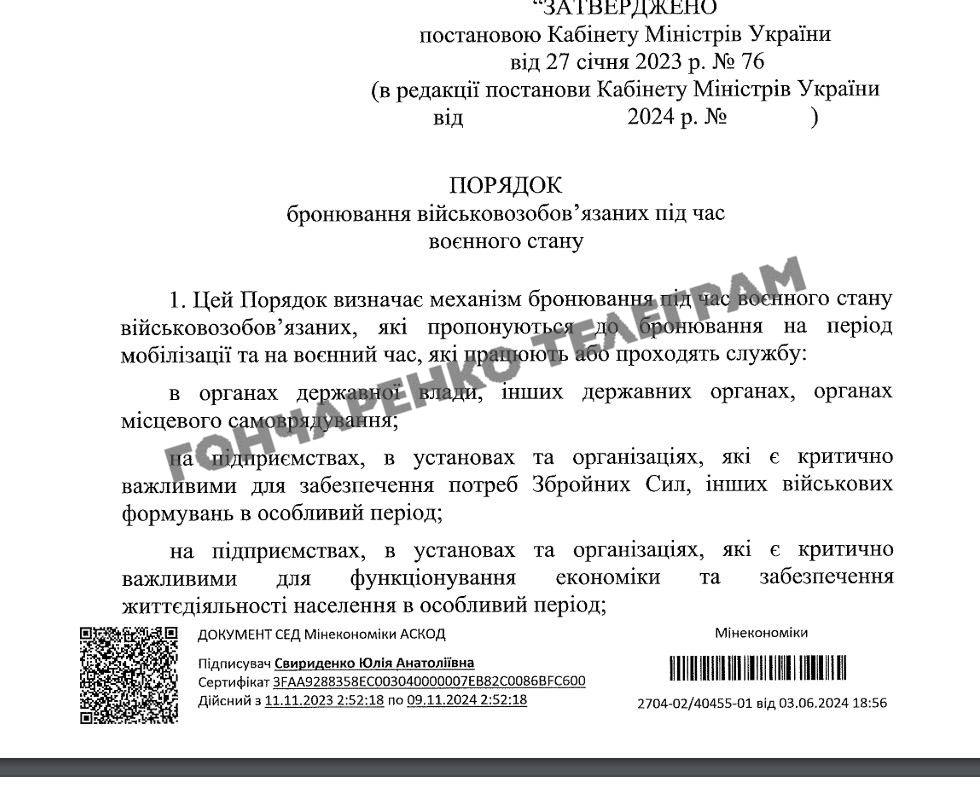 Про це 5 червня повідомив нардеп Олексій Гончаренко з посиланням на постанову уряду від 3 червня 2024 року.