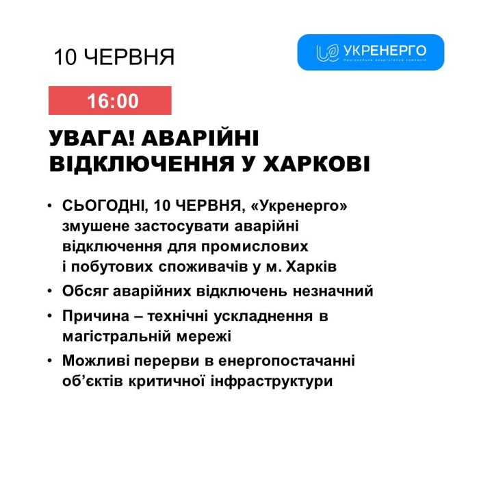 https://racurs.ua/ua/n196185-u-harkovi-rozpochynautsya-avariyni-vidkluchennya-ukrenergo.htmlРакурсУ Харкові сьогодні, 10 червня, застосовуються аварійні відключення для промислових та побутових споживачів.