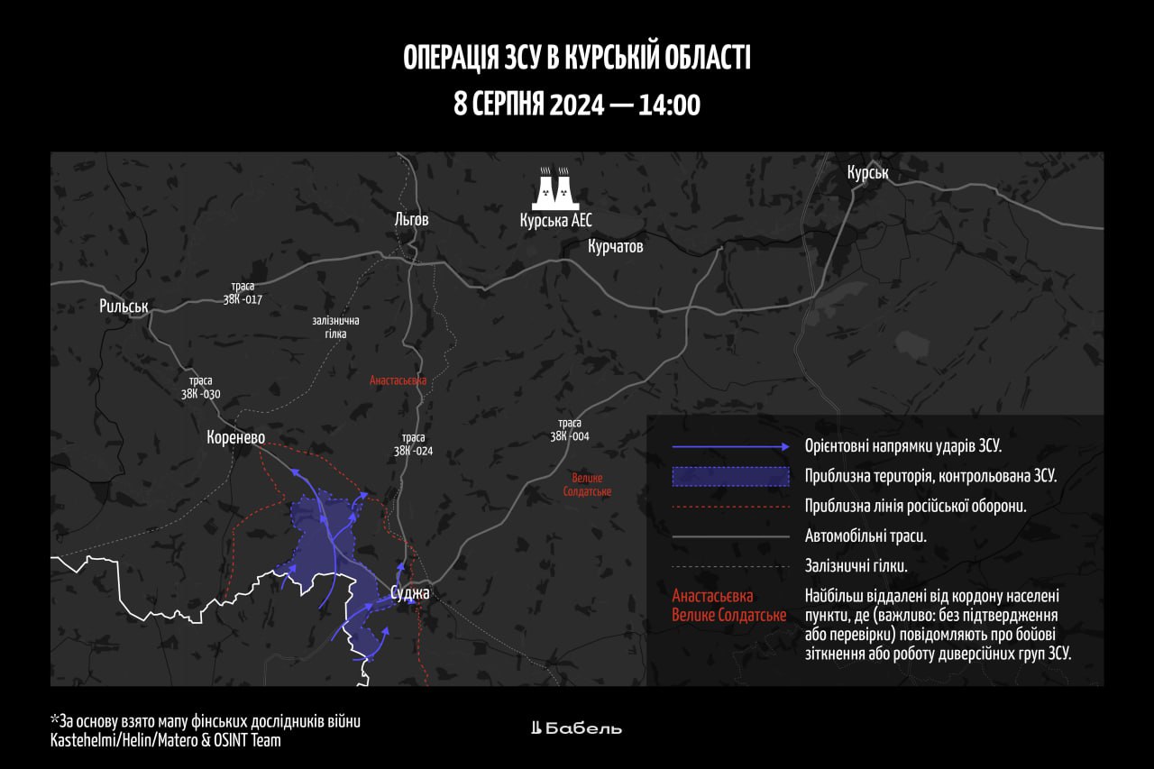 Видання «Бабель» показує, що відомо про операцію ЗСУ вдень 8 серпня з відкритих джерел — повідомлень осінтерів, російських провоєнних телеграм-каналів і телеграм-каналів населених пунктів Курської області. Ці дані з’являються із затримкою, поточна ситуація відрізняється від тієї, що показана на карті.
