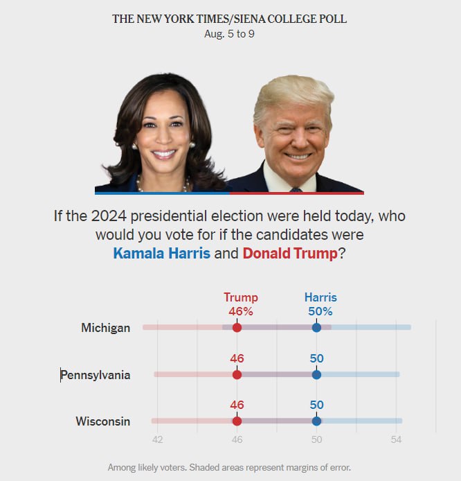 Рейтинг прихильності до Трампа зріс до 46% у трьох штатах. І цього було б достатньо проти Джо Байдена, чий рейтинг на початку липня впав до 30%. Але наразі цього недостатньо проти Гарріс.