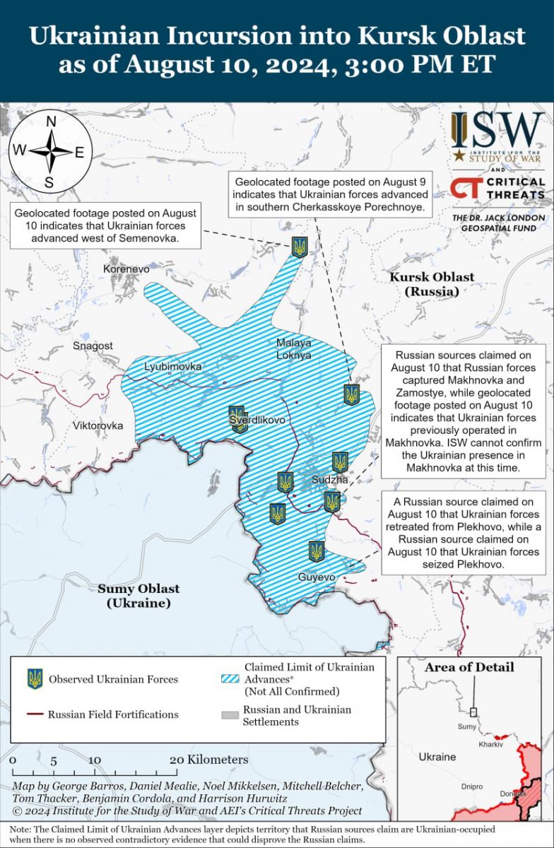 Безпосередньо на Курському напрямку — відбито контратаку росіян у східній частині Суджі. Є просування на схід, уздовж дороги Р-200 у напрямку Курська. Взяте під контроль село Мартиновка, що розташоване на схід від міста.
