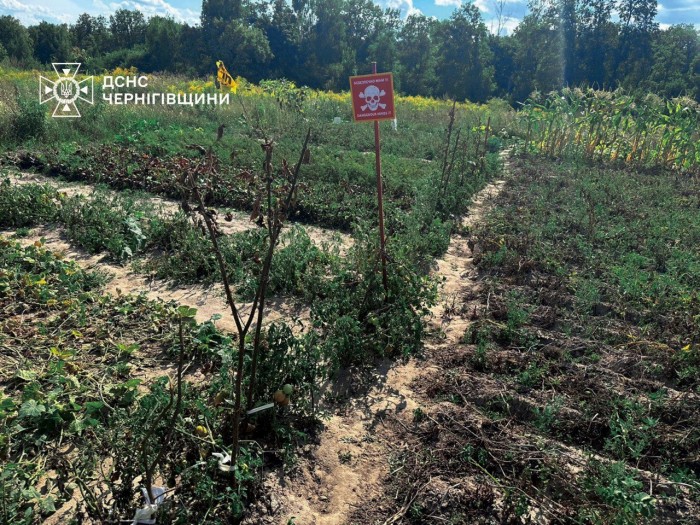 Жителі Чернігівщини підв’язують овочі табличками «Небезпечно, міни!», фото: ДСНС