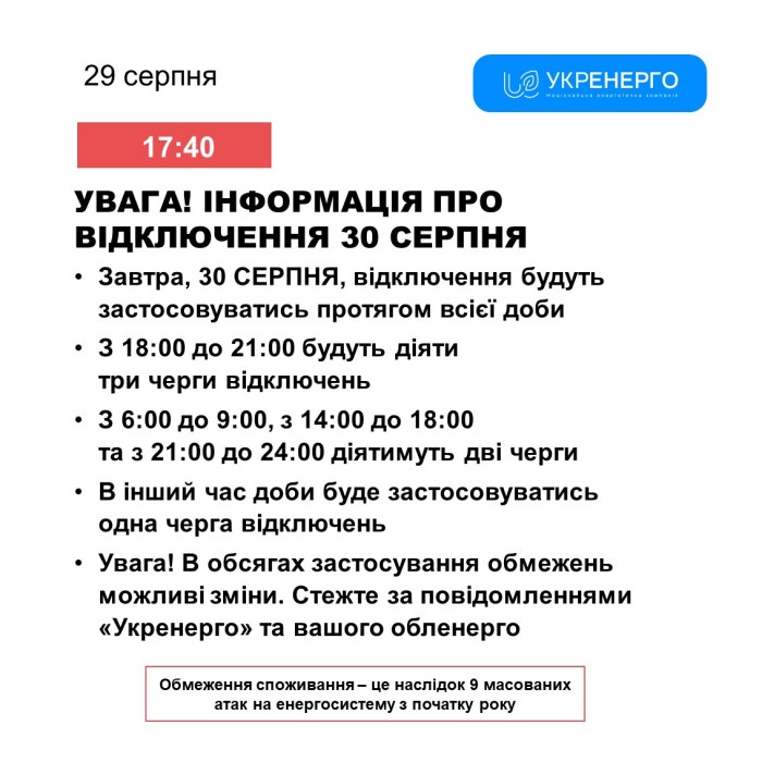 Графіки відключень 30 серпня застосовуватимуть протягом усієї доби — Укренерго
