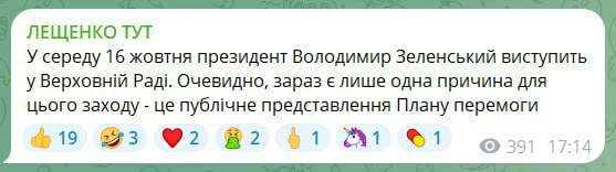 Президент Володимир Зеленський представить «план перемоги» України під час виступу в Верховній Раді 16 жовтня.