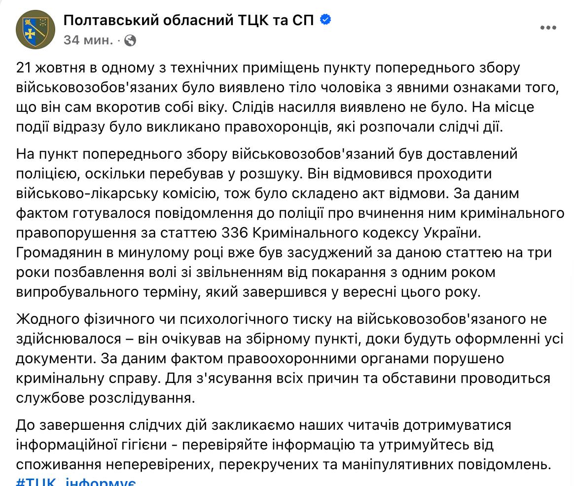 У Полтавській області в одному з технічних приміщень пункту попереднього збору військовозобов’язаних виявили тіло чоловіка. В обласному військкоматі кажуть, що він, імовірно, сам вкоротив собі віку. Про це йдеться в заяві Полтавського обласного Територіального центру комплектування у Telegram.