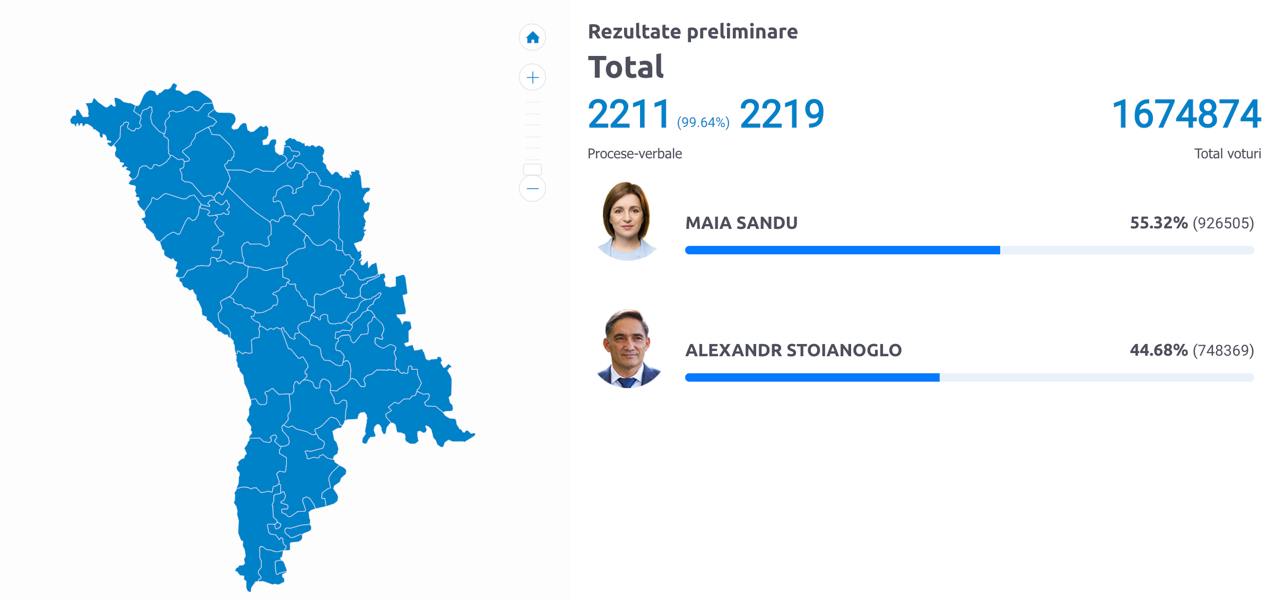 За даними станом на 7.30 за Києвом, коли непідрахованими залишалися голоси всього із семи з 2219 виборчих дільниць, Санду зібрала 55,35% голосів, Стояногло, відповідно — 44,65%.