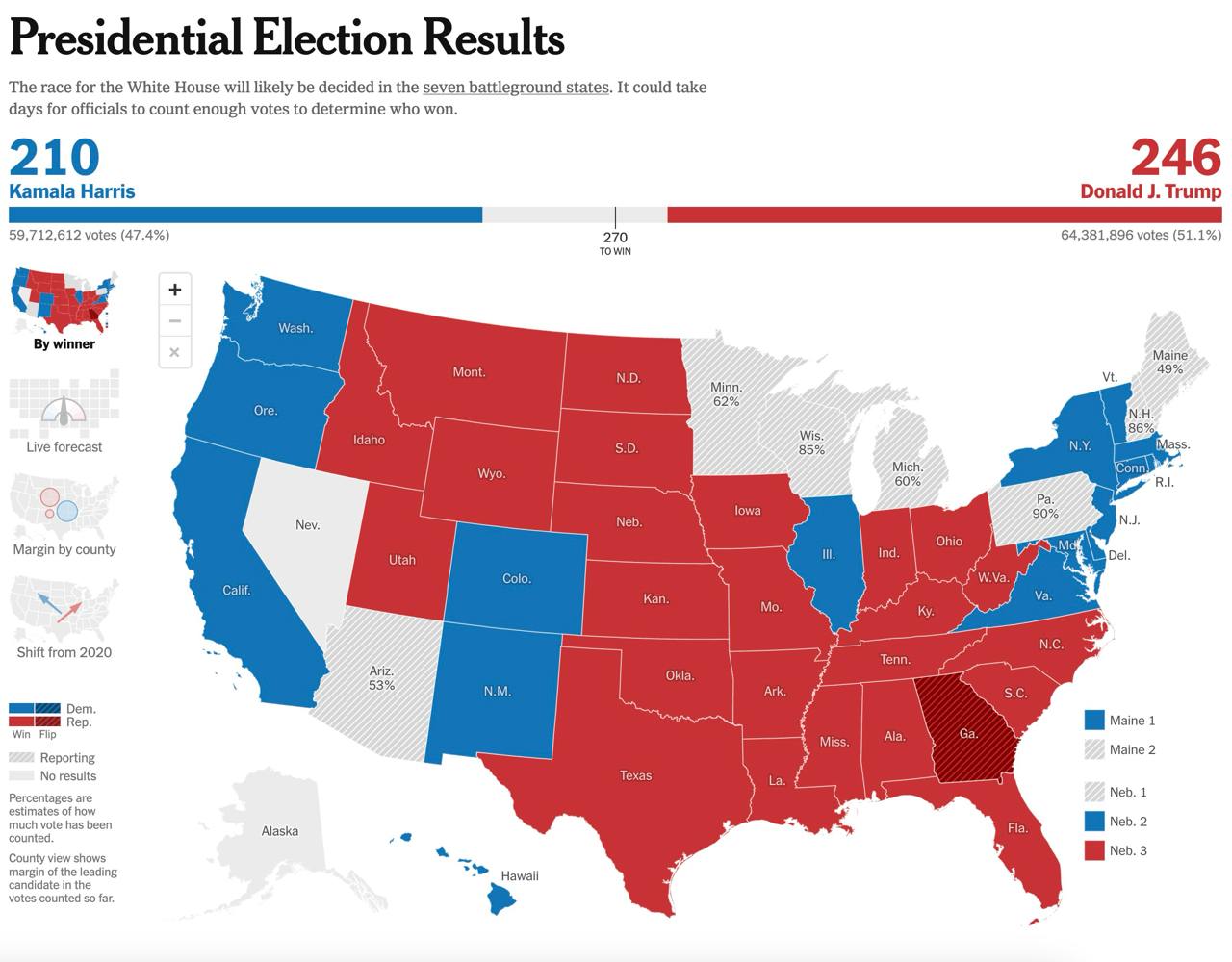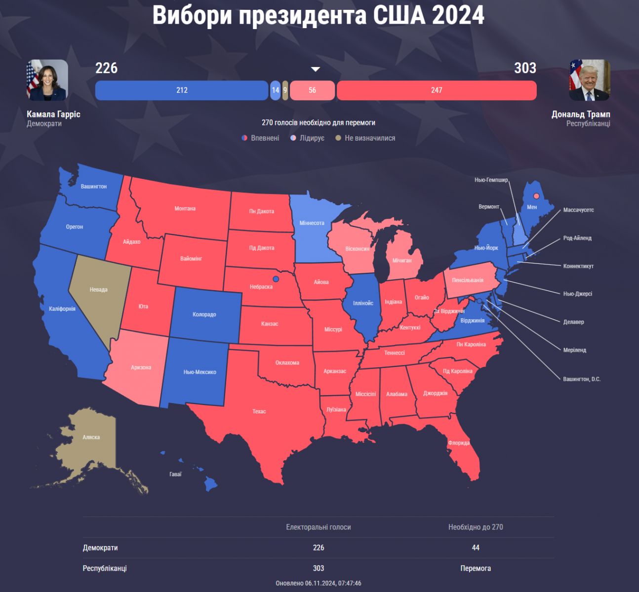 Наразі Трамп здобуває 246 голосів виборників, тоді як представниця демократів Камала Гарріс — 210 виборників. Але підрахунок голосів триває, і ситуація може кардинально змінитися. Для перемоги на президентських виборах кандидатам потрібно здобувати підтримку 270 виборників. Про це свідчать підрахунки Associated Press та моніторингового проекту DeepState.