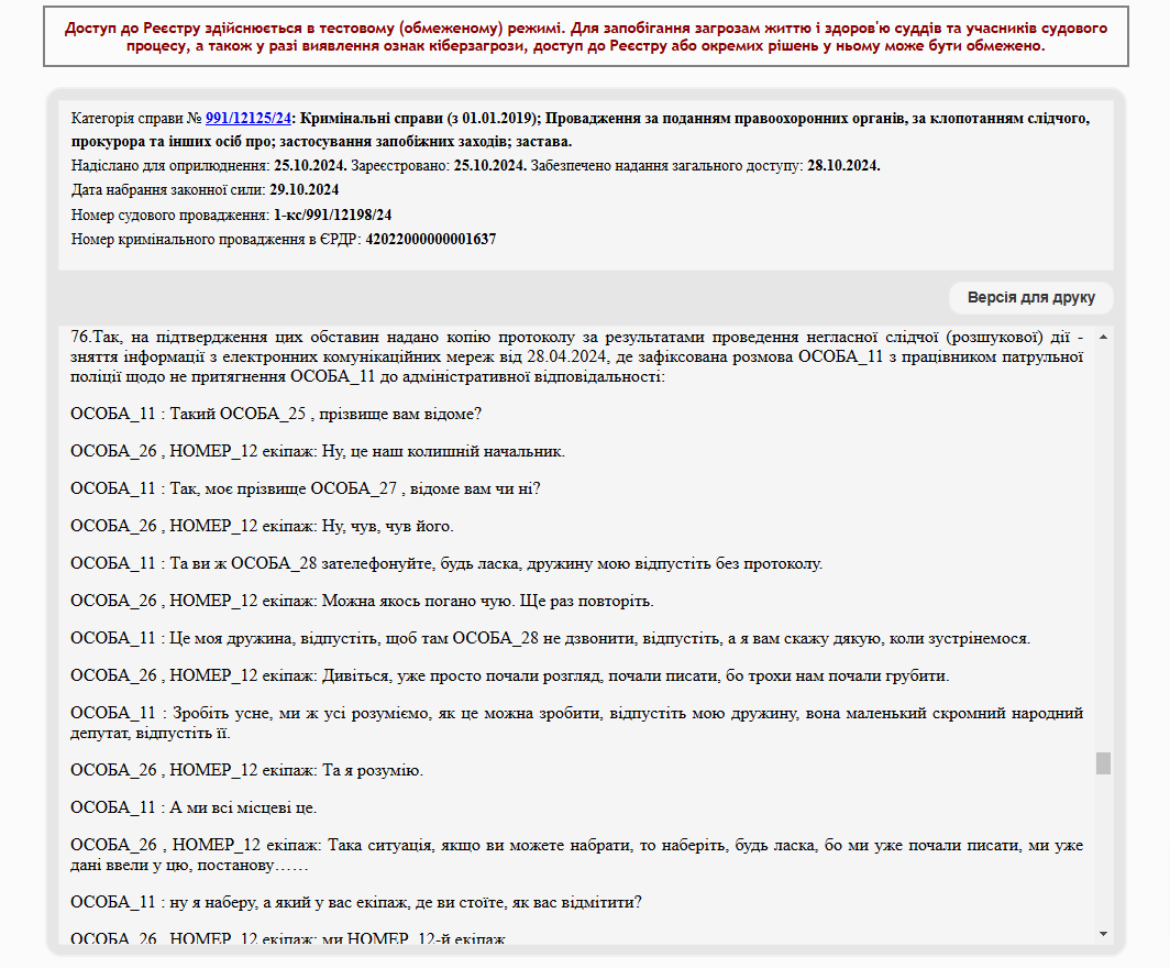 Як йдеться у судовому рішенні про застосування запобіжного заходу від 23 жовтня 2024 року, детективи зафіксували такий діалог:
