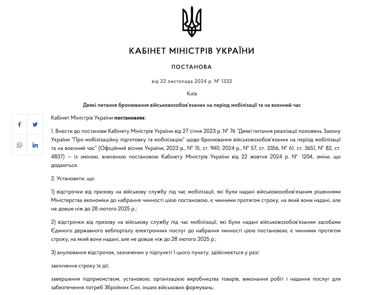 Усі відстрочки від мобілізації, видані раніше Мінекономіки і через «Дію», втратять чинність 28 лютого 2025 року. Відстрочки також анулюються у випадках втрати статусу критично важливого підприємства або ліквідації організації з бронюванням.