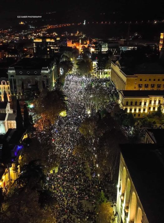 Тисячі людей 30 листопада увечері знову стоять на проспекті Руставелі перед парламентом Грузії. Дві ночі поспіль акцію жорстко розганяли, але люди знову прийшли. На майдані Свободи знову спецтехніка, водомети, спецназ.