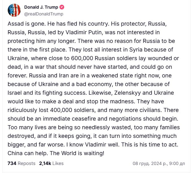 Також обраний президент Сполучених Штатів заявив, що рф втратила у війні 600 тис. військових пораненими й убитими й саме тому вона не зацікавлена в захисті режиму Башара Асада в Сирії. Тим часом Іран теж ослаблений через успіхи Ізраїлю.