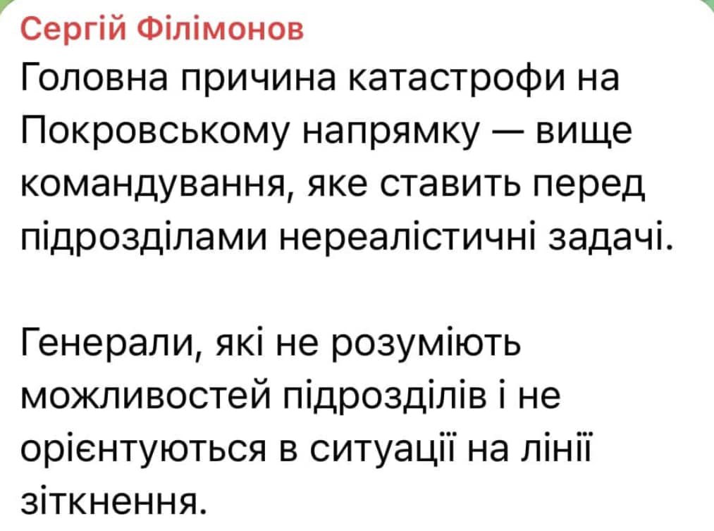 Так, не чисельна перевага ворога, не нестача людей у нас, а в першу чергу управління та організація військ, ось що турбує війська у першу чергу. Переважна більшість командирів частин та підрозділів під Покровськом говорять те саме, — написав комбат Філімонов.