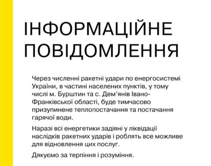 Раніше сьогодні на Фейсбук-сторінці Бурштинської ТЕС з’явилося повідомлення, що в частині населених пунктів, зокрема місті Бурштин та селі Дем’янів Івано-Франківської області, тимчасово не буде теплопостачання та гарячої води.