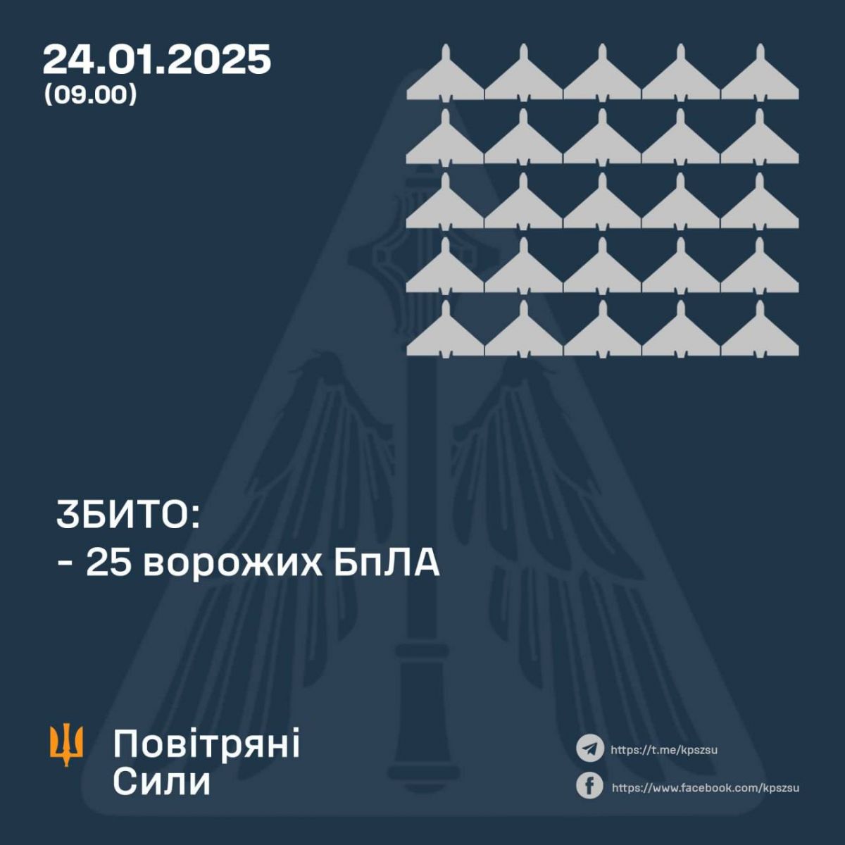 https://racurs.ua/ua/n203426-syly-ppo-vnochi-zbyly-25-z-58-rosiyskyh-droniv.htmlРакурсКраїна-агресор росія вночі 24 січня атакувала Україну 58-ма ударними БпЛА типу Shahed і безпілотниками-імітаторами різних типів.