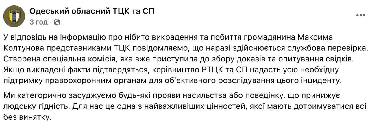 У відповідь на інформацію про нібито викрадення та побиття громадянина Максима Колтунова представниками ТЦК повідомляємо, що наразі здійснюється службова перевірка. Створена спеціальна комісія, яка вже розпочала збір доказів та опитування свідків, — йдеться у повідомленні Одеського обласного ТЦК.