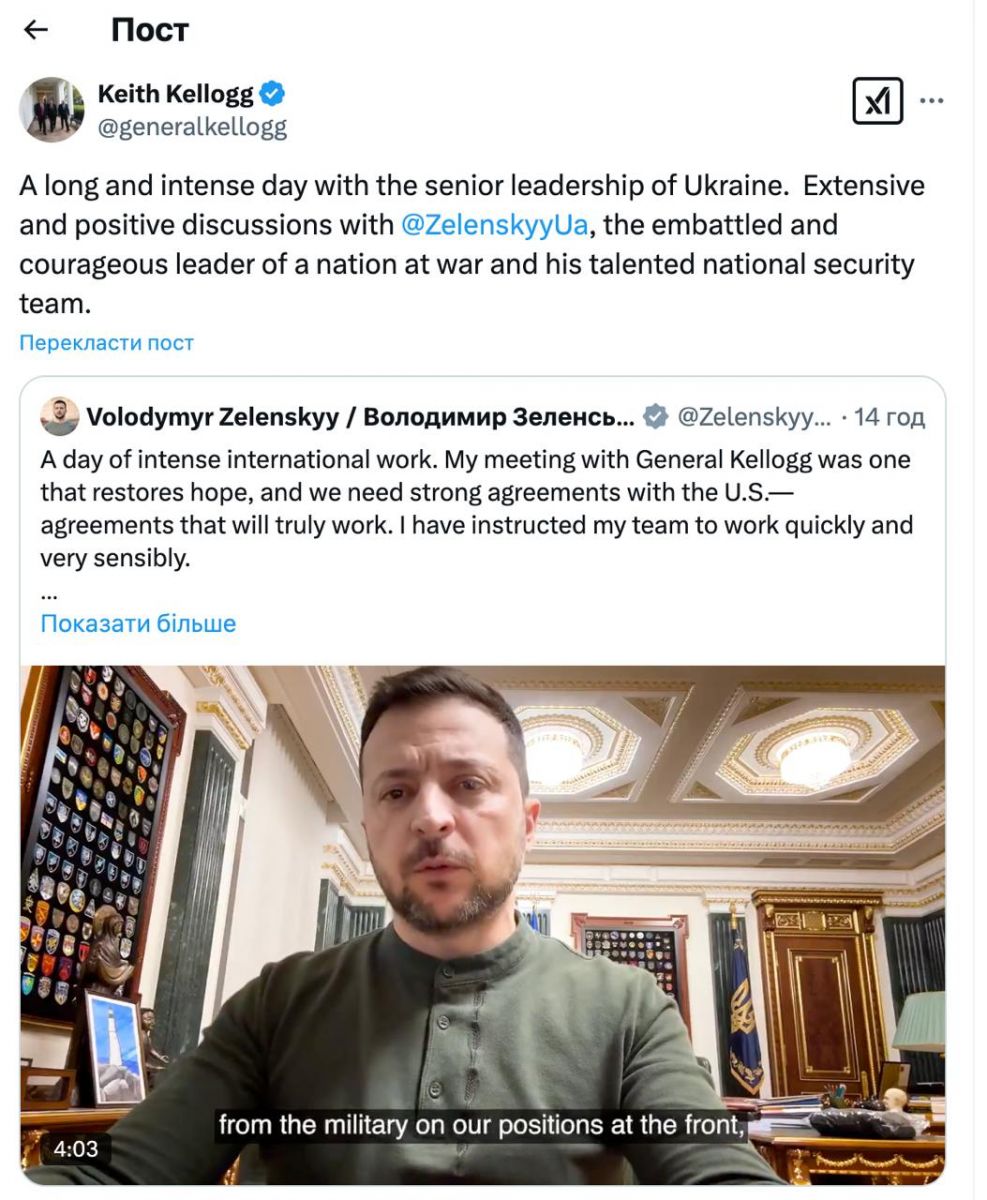 За словами представника адміністрації Дональда Трампа, дискусії у Києві були «широкими та позитивними». Щодо глави України, то Келлог назвав Зеленського «відважним лідером нації». Відповідний допис американець розмістив у соціальній мережі Х.