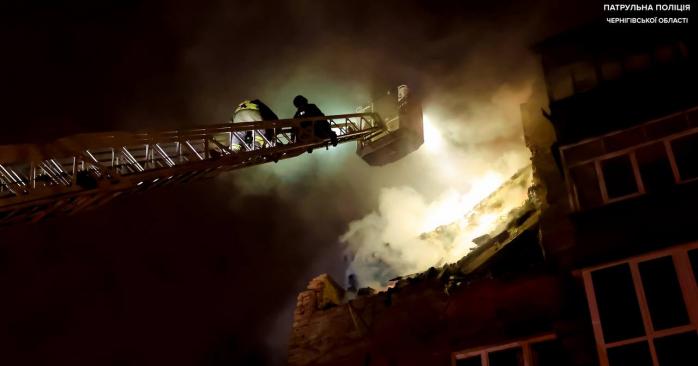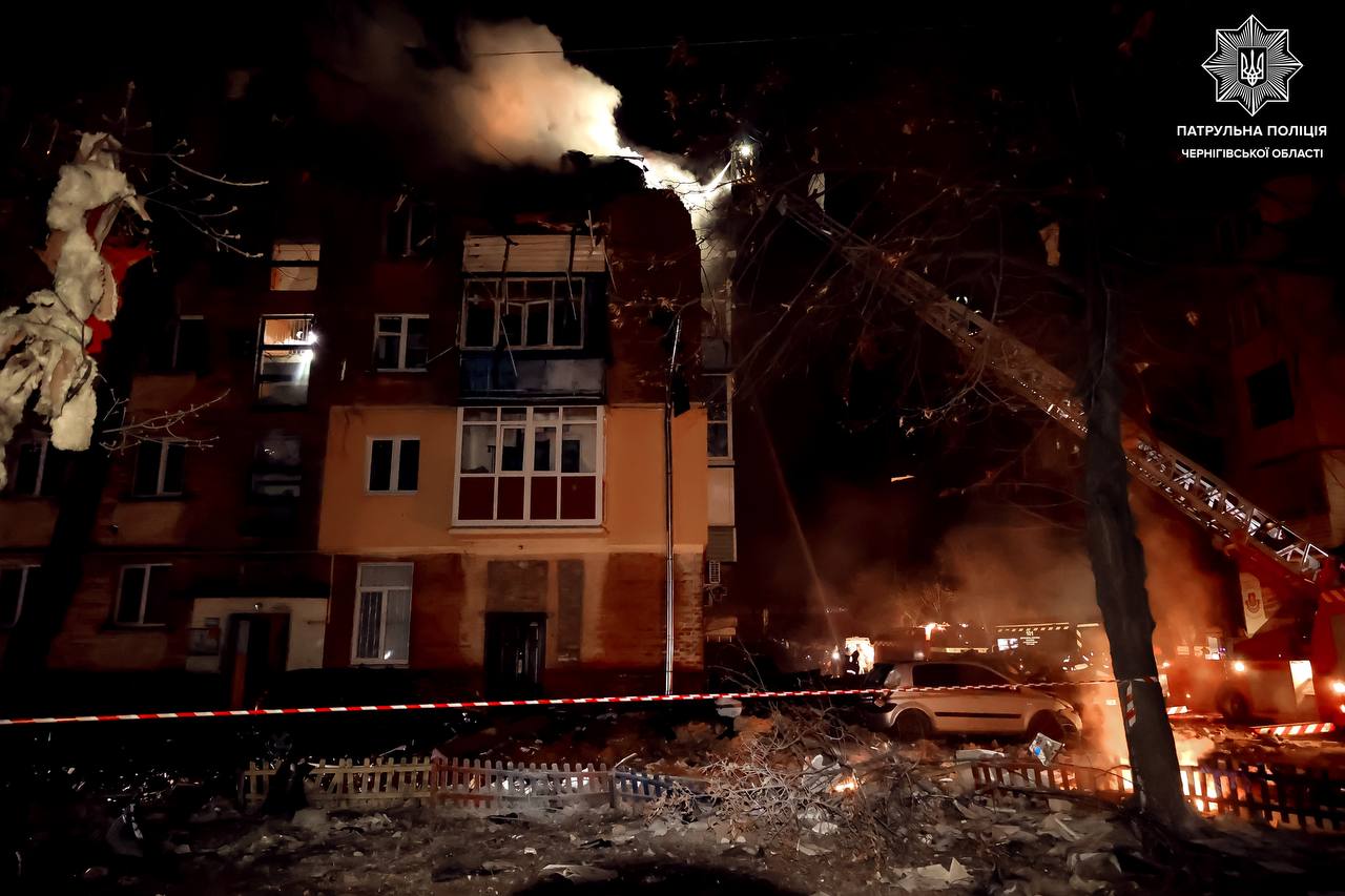Патрульна поліція України у Telegram поінформувала, що у Чернігові сталися пожежі в житлових будинках, частково зруйновано два поверхи багатоповерхівки та пошкоджено автомобілі. Попередньо, обійшлося без жертв і постраждалих.