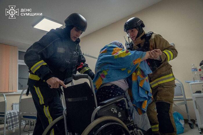 Наслідки атаки російського безпілотника по лікарні у Сумах, фото: ДСНС