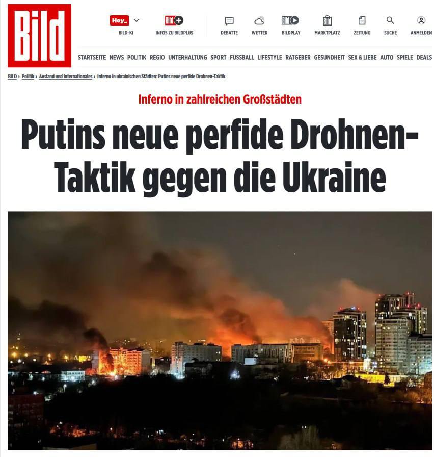 Ударні БпЛА типу «Шахед» атакують українські міста за новою, раніше невідомою та ще більш смертоносною тактикою, ніж раніше. Загарбники вже не атакують дронами, як раніше один за одним з інтервалом у кілька хвилин. Про це пише німецьке видання Bild.