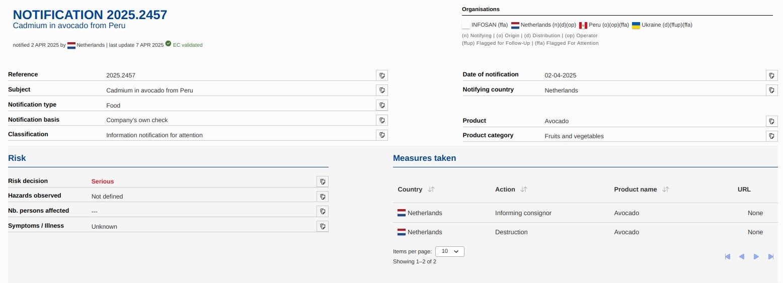 Він додав, що за інформацією Європейської системи швидкого оповіщення про харчові продукти і корми (RASFF), голландська сторона прийняла рішення не поширювати небезпечну продукцію. Наразі ця партія авокадо утилізована.
