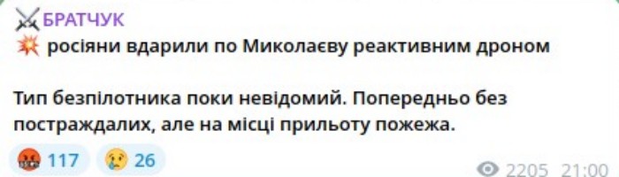 Також про влучання невідомого реактивного дрона у Миколаєві у своєму Telegram-каналі повідомив речник Української добровольчої армії Сергій Братчук.